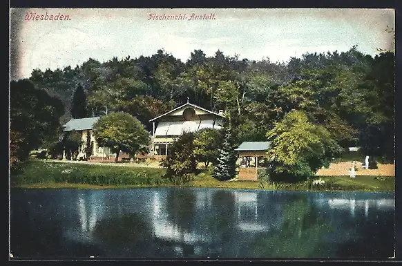 AK Wiesbaden, Uferansicht mit Gasthaus Fischzucht-Anstalt