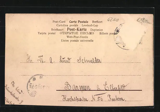 Personenbezogene Daten auf der Rückseite der Karte wurden durch blauen Textmarker unkenntlich gemacht. Die blauen Stellen sind auf die Vorderseite durchgeweicht und wirken sich negativ auf das Postkartenfoto aus