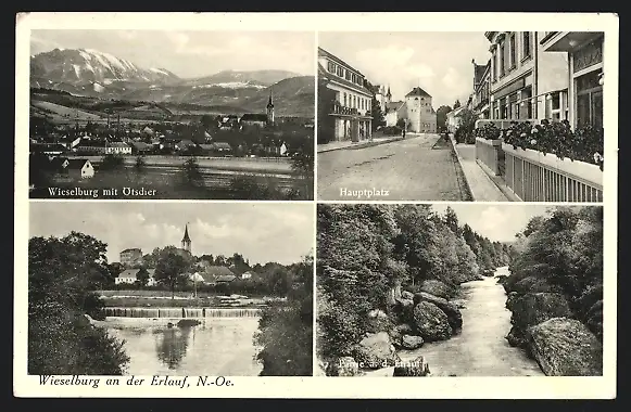 AK Wieselburg a. d. Erlauf, Ortsansicht mit Oetscher, Hauptplatz, Partie an der Erlauf