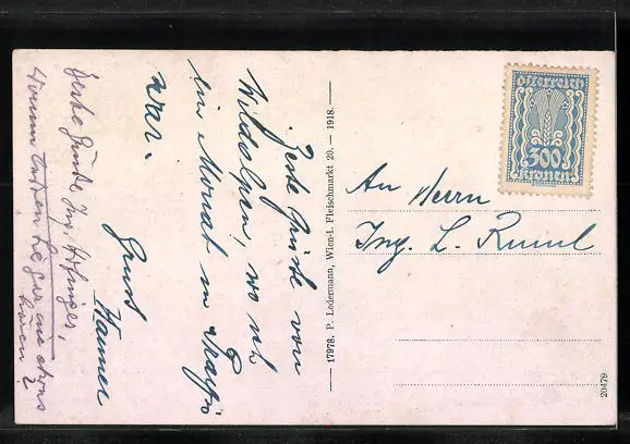 Personenbezogene Daten auf der Rückseite der Karte wurden durch blauen Textmarker unkenntlich gemacht. Die blauen Stellen sind auf die Vorderseite durchgeweicht und wirken sich negativ auf das Postkartenfoto aus