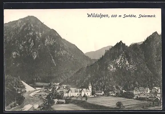 AK Wildalpen, Ortsansicht mit Bergmassiv