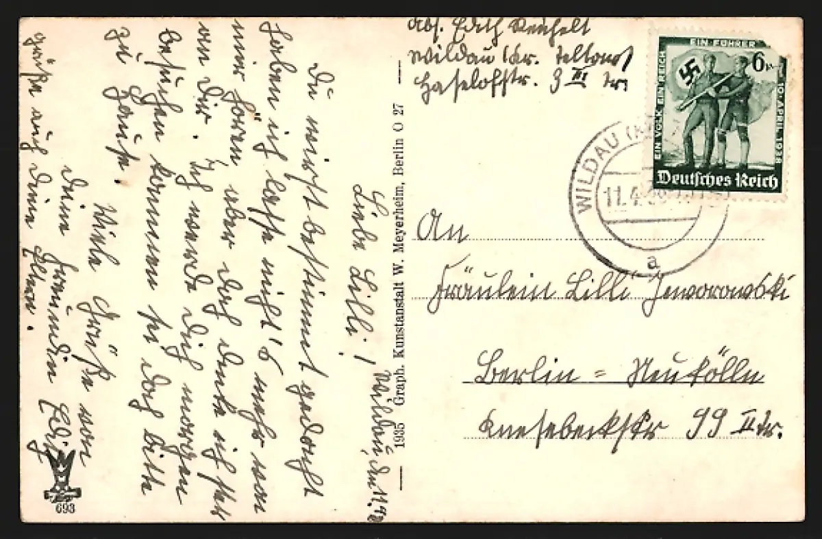Personenbezogene Daten auf der Rückseite der Karte wurden durch blauen Textmarker unkenntlich gemacht. Die blauen Stellen sind auf die Vorderseite durchgeweicht und wirken sich negativ auf das Postkartenfoto aus