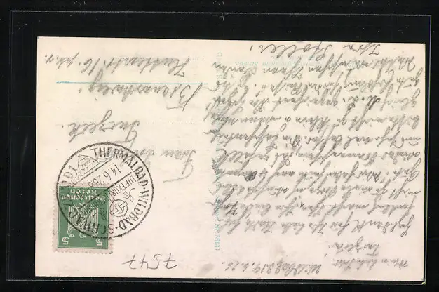 Personenbezogene Daten auf der Rückseite der Karte wurden durch blauen Textmarker unkenntlich gemacht. Die blauen Stellen sind auf die Vorderseite durchgeweicht und wirken sich negativ auf das Postkartenfoto aus