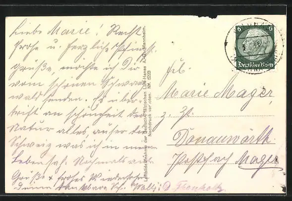 Personenbezogene Daten auf der Rückseite der Karte wurden durch blauen Textmarker unkenntlich gemacht. Die blauen Stellen sind auf die Vorderseite durchgeweicht und wirken sich negativ auf das Postkartenfoto aus