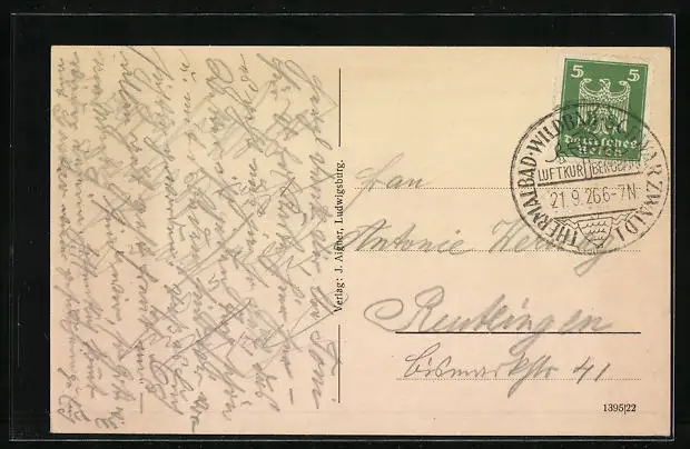 Personenbezogene Daten auf der Rückseite der Karte wurden durch blauen Textmarker unkenntlich gemacht. Die blauen Stellen sind auf die Vorderseite durchgeweicht und wirken sich negativ auf das Postkartenfoto aus