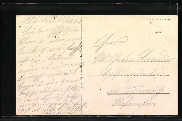 Personenbezogene Daten auf der Rückseite der Karte wurden durch blauen Textmarker unkenntlich gemacht. Die blauen Stellen sind auf die Vorderseite durchgeweicht und wirken sich negativ auf das Postkartenfoto aus