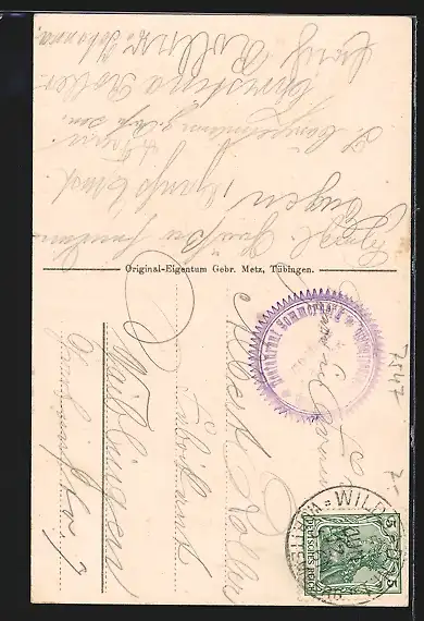 Personenbezogene Daten auf der Rückseite der Karte wurden durch blauen Textmarker unkenntlich gemacht. Die blauen Stellen sind auf die Vorderseite durchgeweicht und wirken sich negativ auf das Postkartenfoto aus