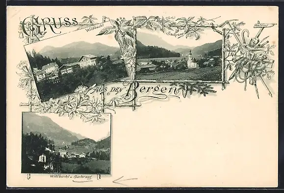 AK Wildbüchl, Ortsansicht mit Sachrang und Umgebung, Edelweiss-Passepartout