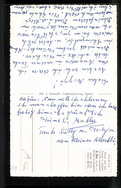 Personenbezogene Daten auf der Rückseite der Karte wurden durch blauen Textmarker unkenntlich gemacht. Die blauen Stellen sind auf die Vorderseite durchgeweicht und wirken sich negativ auf das Postkartenfoto aus