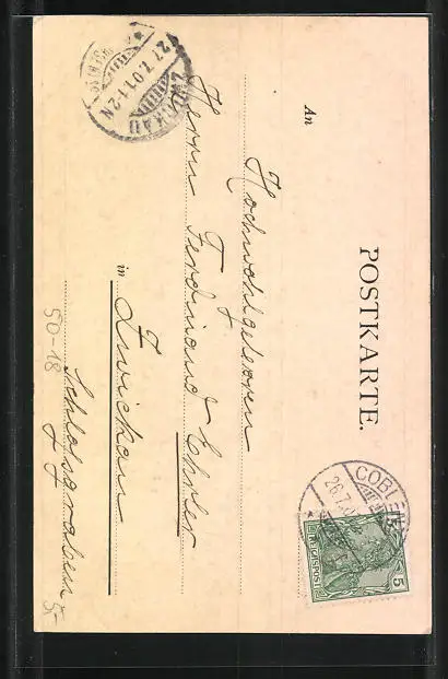 Personenbezogene Daten auf der Rückseite der Karte wurden durch blauen Textmarker unkenntlich gemacht. Die blauen Stellen sind auf die Vorderseite durchgeweicht und wirken sich negativ auf das Postkartenfoto aus