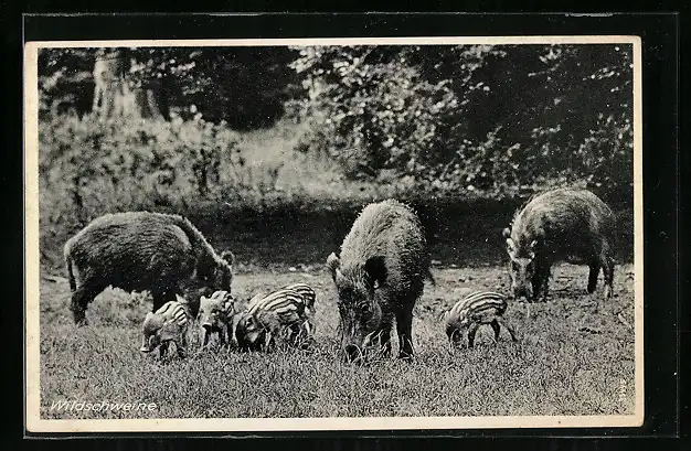 AK Wildschweine mit Frischlingen auf einer Wiese