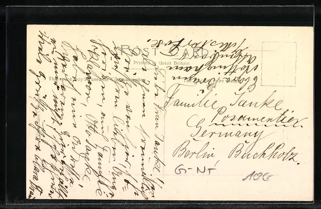 Personenbezogene Daten auf der Rückseite der Karte wurden durch blauen Textmarker unkenntlich gemacht. Die blauen Stellen sind auf die Vorderseite durchgeweicht und wirken sich negativ auf das Postkartenfoto aus