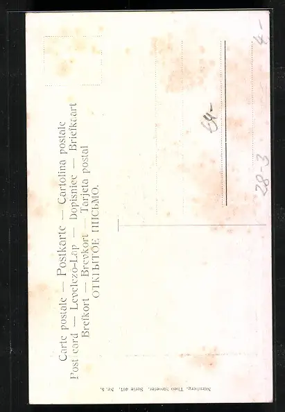 Personenbezogene Daten auf der Rückseite der Karte wurden durch blauen Textmarker unkenntlich gemacht. Die blauen Stellen sind auf die Vorderseite durchgeweicht und wirken sich negativ auf das Postkartenfoto aus