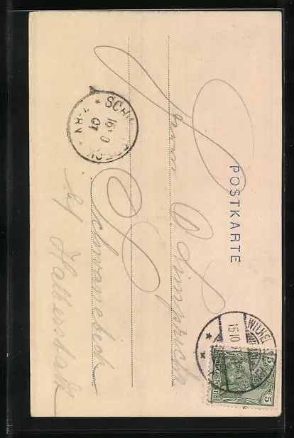 Personenbezogene Daten auf der Rückseite der Karte wurden durch blauen Textmarker unkenntlich gemacht. Die blauen Stellen sind auf die Vorderseite durchgeweicht und wirken sich negativ auf das Postkartenfoto aus