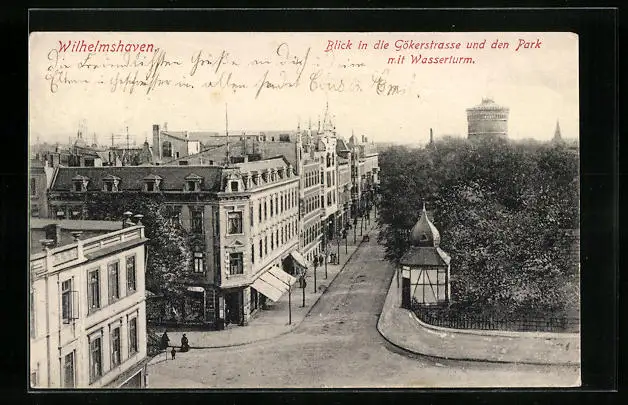 AK Wilhelmshaven, Blick in die Gökerstrasse und den Park mit Wasserturm