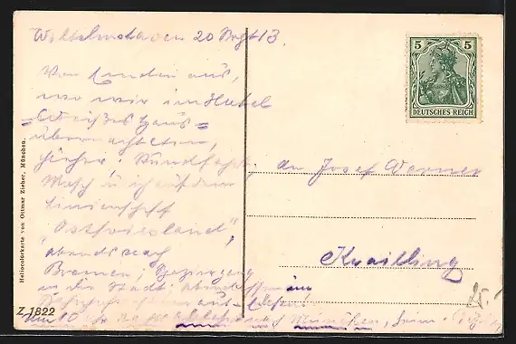 Personenbezogene Daten auf der Rückseite der Karte wurden durch blauen Textmarker unkenntlich gemacht. Die blauen Stellen sind auf die Vorderseite durchgeweicht und wirken sich negativ auf das Postkartenfoto aus