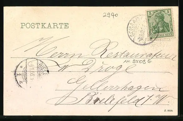 Personenbezogene Daten auf der Rückseite der Karte wurden durch blauen Textmarker unkenntlich gemacht. Die blauen Stellen sind auf die Vorderseite durchgeweicht und wirken sich negativ auf das Postkartenfoto aus