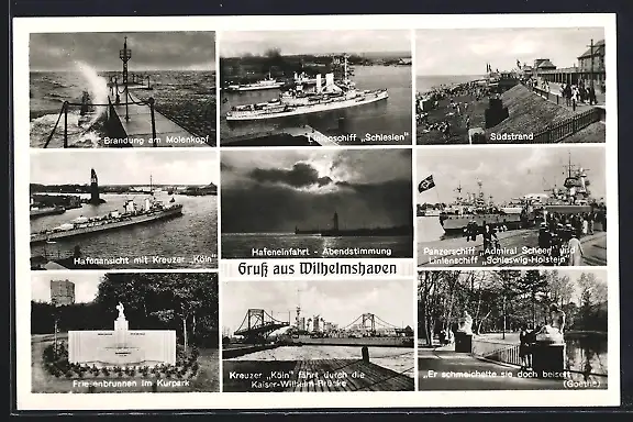 AK Wilhelmshaven, Hafeneinfahrt, Panzerschiff Admiral Scheer, Südstrand