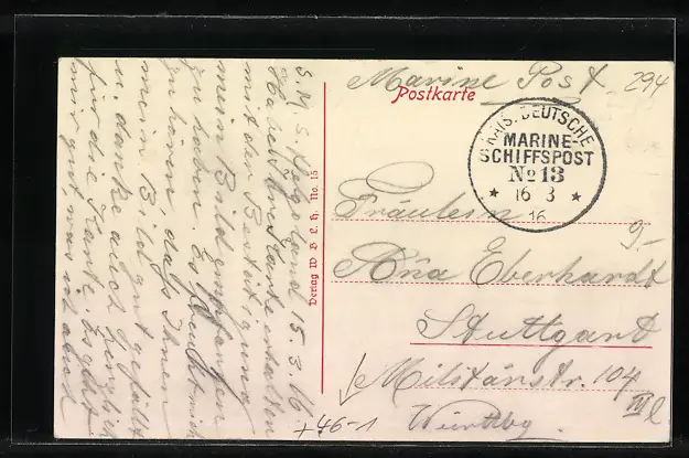 Personenbezogene Daten auf der Rückseite der Karte wurden durch blauen Textmarker unkenntlich gemacht. Die blauen Stellen sind auf die Vorderseite durchgeweicht und wirken sich negativ auf das Postkartenfoto aus