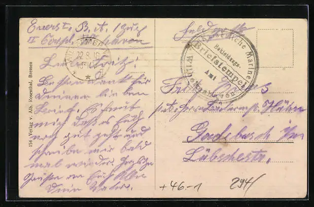 Personenbezogene Daten auf der Rückseite der Karte wurden durch blauen Textmarker unkenntlich gemacht. Die blauen Stellen sind auf die Vorderseite durchgeweicht und wirken sich negativ auf das Postkartenfoto aus