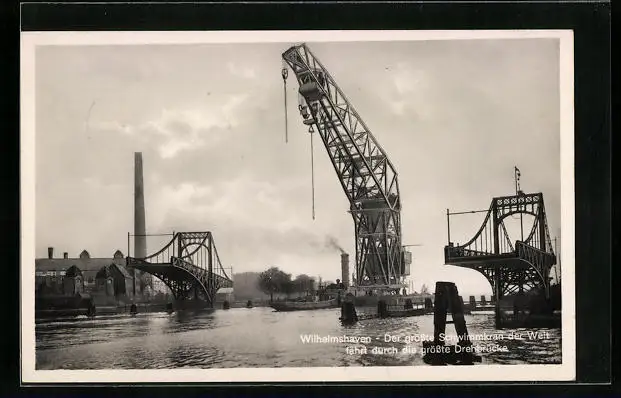 AK Wilhelmshaven, Schwimmkran fährt durch Drehbrücke