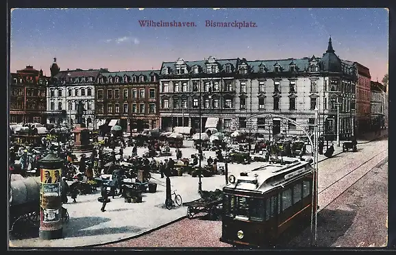 AK Wilhelmshaven, Strassenbahn und Litfasssäule am Bismarckplatz