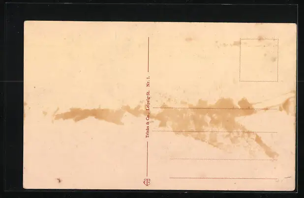 Personenbezogene Daten auf der Rückseite der Karte wurden durch blauen Textmarker unkenntlich gemacht. Die blauen Stellen sind auf die Vorderseite durchgeweicht und wirken sich negativ auf das Postkartenfoto aus