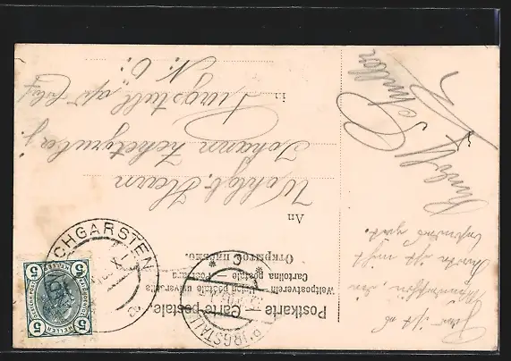 Personenbezogene Daten auf der Rückseite der Karte wurden durch blauen Textmarker unkenntlich gemacht. Die blauen Stellen sind auf die Vorderseite durchgeweicht und wirken sich negativ auf das Postkartenfoto aus