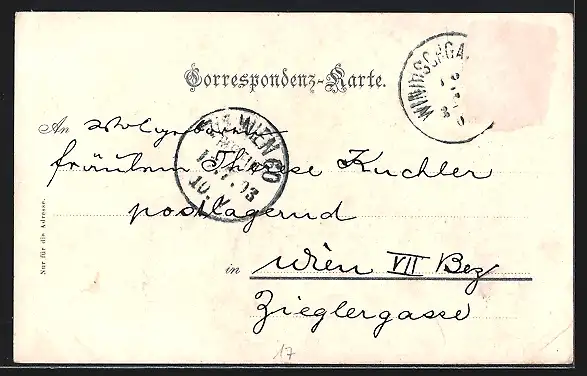 alte Ansichtskarte, gelaufen 1903, Briefmarke entfernt, rückseitig Oberflächenschaden, Eckknick li. unten, Bugspur re. unten, guter Zustand