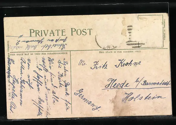 Personenbezogene Daten auf der Rückseite der Karte wurden durch blauen Textmarker unkenntlich gemacht. Die blauen Stellen sind auf die Vorderseite durchgeweicht und wirken sich negativ auf das Postkartenfoto aus