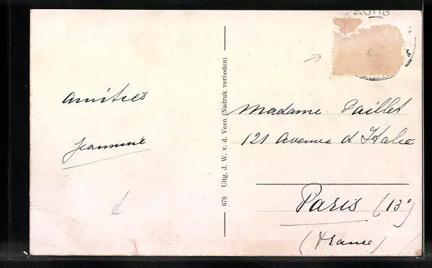 Personenbezogene Daten auf der Rückseite der Karte wurden durch blauen Textmarker unkenntlich gemacht. Die blauen Stellen sind auf die Vorderseite durchgeweicht und wirken sich negativ auf das Postkartenfoto aus