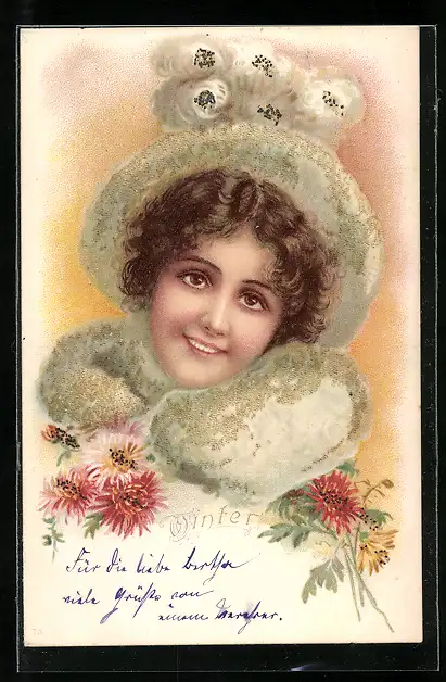 AK Winter, Frau im Pelz mit Blumen