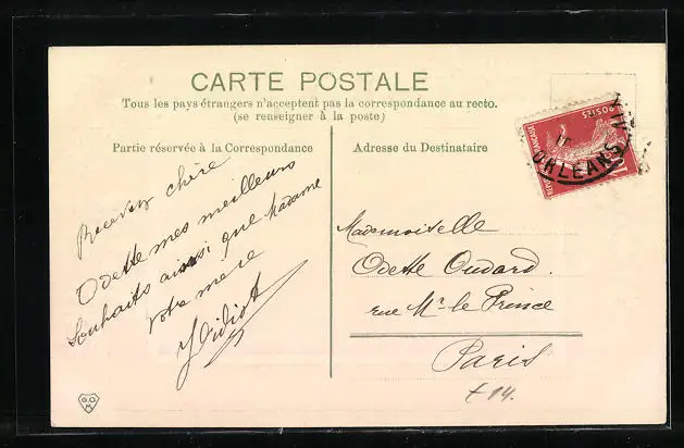 Personenbezogene Daten auf der Rückseite der Karte wurden durch blauen Textmarker unkenntlich gemacht. Die blauen Stellen sind auf die Vorderseite durchgeweicht und wirken sich negativ auf das Postkartenfoto aus