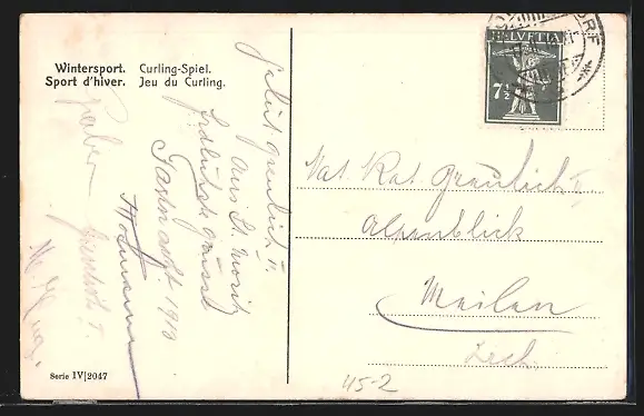 Personenbezogene Daten auf der Rückseite der Karte wurden durch blauen Textmarker unkenntlich gemacht. Die blauen Stellen sind auf die Vorderseite durchgeweicht und wirken sich negativ auf das Postkartenfoto aus