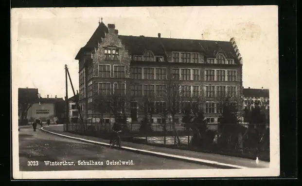 AK Winterthur, Schulhaus Geiselweid mit Strassenpartie
