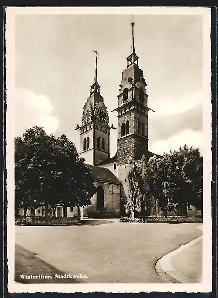 AK Winterthur, Stadtkirche mit Strassenpartie