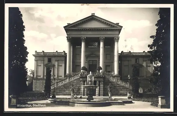 AK Winterthur, Strassenpartie mit Brunnen vor Stadthaus
