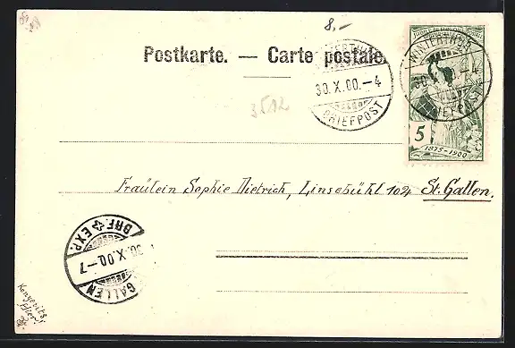 alte Ansichtskarte, gelaufen 1900, kleiner Einriss oben mittig, guter Zustand