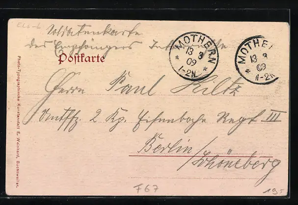 Personenbezogene Daten auf der Rückseite der Karte wurden durch blauen Textmarker unkenntlich gemacht. Die blauen Stellen sind auf die Vorderseite durchgeweicht und wirken sich negativ auf das Postkartenfoto aus