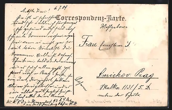 Personenbezogene Daten auf der Rückseite der Karte wurden durch blauen Textmarker unkenntlich gemacht. Die blauen Stellen sind auf die Vorderseite durchgeweicht und wirken sich negativ auf das Postkartenfoto aus