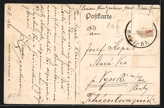 alte Ansichtskarte, gelaufen 1921, Briefmarke entfernt, rückseitig Oberflächenschaden, guter Zustand