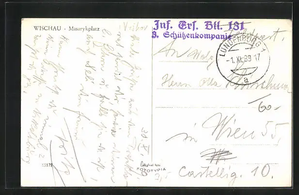 Personenbezogene Daten auf der Rückseite der Karte wurden durch blauen Textmarker unkenntlich gemacht. Die blauen Stellen sind auf die Vorderseite durchgeweicht und wirken sich negativ auf das Postkartenfoto aus