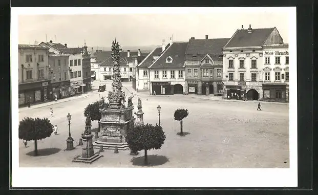 AK Wischau / Vyskov, Platz mit Geschäften und Denkmal