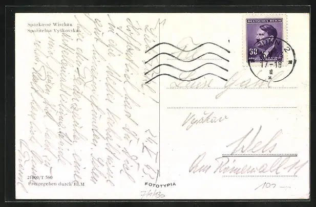 Personenbezogene Daten auf der Rückseite der Karte wurden durch blauen Textmarker unkenntlich gemacht. Die blauen Stellen sind auf die Vorderseite durchgeweicht und wirken sich negativ auf das Postkartenfoto aus
