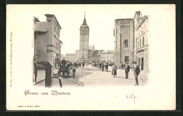 AK Wischau / Vyskov, Strassenpartie mit Kirche