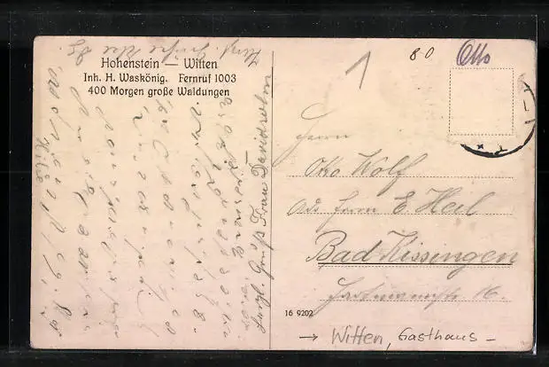 Personenbezogene Daten auf der Rückseite der Karte wurden durch blauen Textmarker unkenntlich gemacht. Die blauen Stellen sind auf die Vorderseite durchgeweicht und wirken sich negativ auf das Postkartenfoto aus