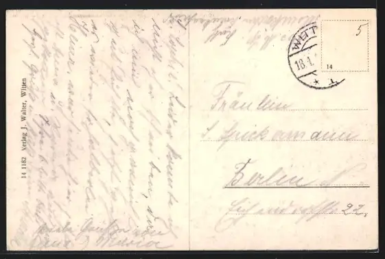 Personenbezogene Daten auf der Rückseite der Karte wurden durch blauen Textmarker unkenntlich gemacht. Die blauen Stellen sind auf die Vorderseite durchgeweicht und wirken sich negativ auf das Postkartenfoto aus