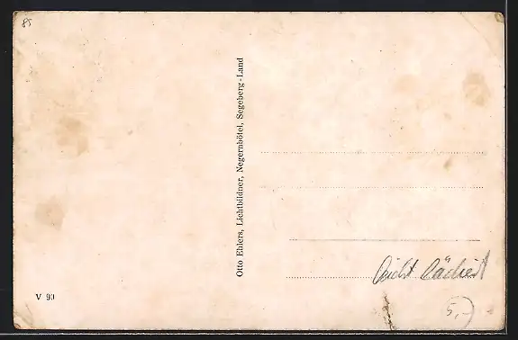 Personenbezogene Daten auf der Rückseite der Karte wurden durch blauen Textmarker unkenntlich gemacht. Die blauen Stellen sind auf die Vorderseite durchgeweicht und wirken sich negativ auf das Postkartenfoto aus