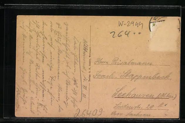 Personenbezogene Daten auf der Rückseite der Karte wurden durch blauen Textmarker unkenntlich gemacht. Die blauen Stellen sind auf die Vorderseite durchgeweicht und wirken sich negativ auf das Postkartenfoto aus