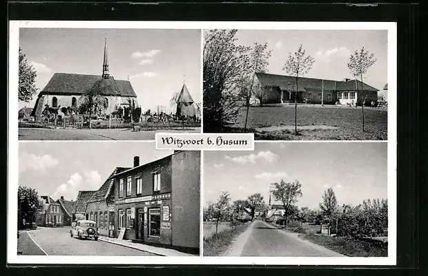 AK Witzwort b. Husum, Kirche, Strassenpartie mit einem Auto